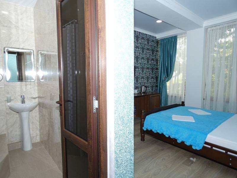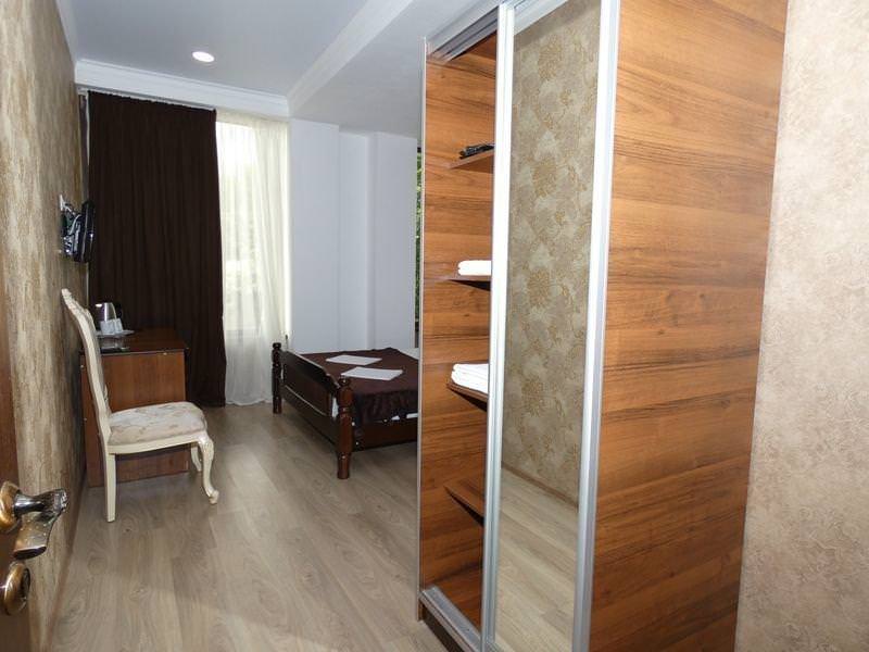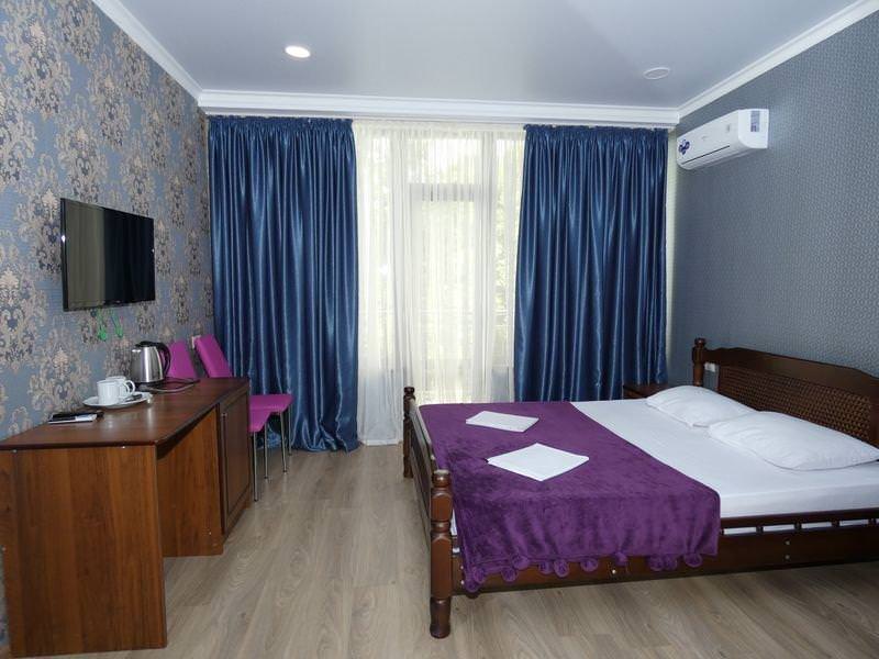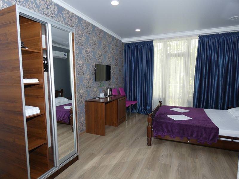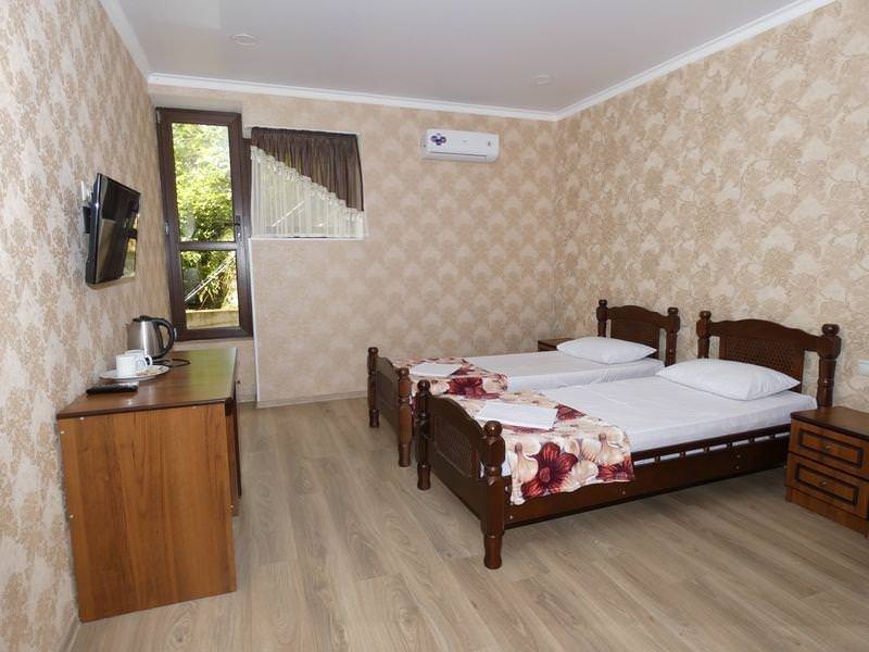 Оснащение номера: двуспальная кровать или две односпальные, шкаф, стулья, прикроватные тумбочки, вешалка, зеркало. Удобства: сплит-система, телевизор, спутниковое ТВ, холодильник, эл. чайник, посуда, балкон, интернет.